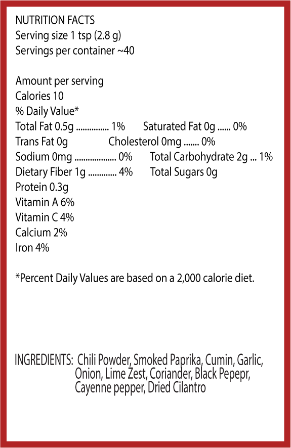 Bright chili spice and zesty lime come together in this bold, salt-free and sugar-free seasoning. Perfect for shrimp, chicken, fish, grilled vegetables, and tacos with a fresh citrus heat. 🌶️🍋